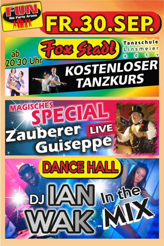 Party mit DJ IAN WAK in der DANCE HALL und kostenloser Tanzkurs mit der Tanzschule Linsmeier im Fox Stadl. Außerdem magisches Special: Zauberer Guiseppe LIVE!