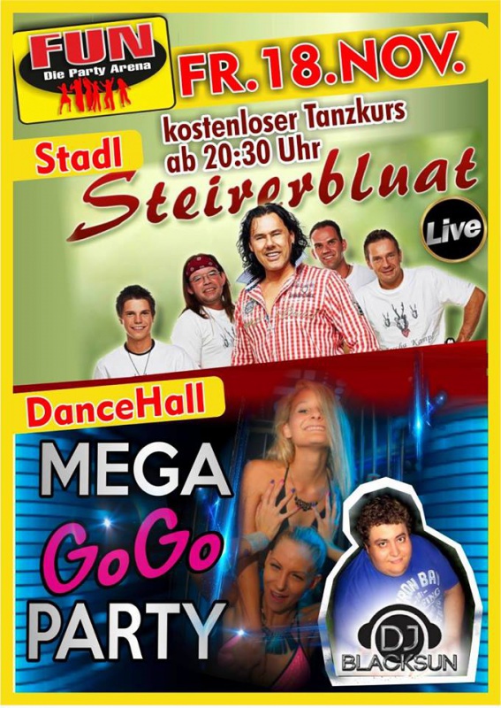 Freuen Sie sich auf die Mega GOGO Party mit DJ Blacksun in der Dance Hall und super Stimmung mit Steirerbluat live im Stadl! Wie immer mit kostenlosem Tanzkurs ab 20:30 Uhr!