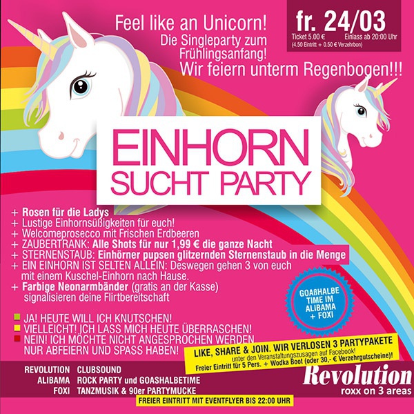EINHORN SUCHT PARTY - Feel like a Unicorn! Die Singleparty zum Frühlingsanfang! Wir feiern unterm Regenbogen!!!