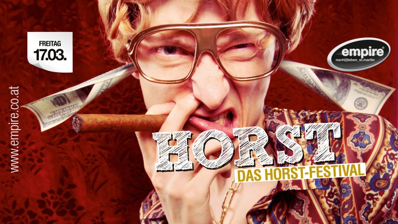 Heast Horst - heid gehts um nix ;) HEAST auf HORST? Du heißt Horst? Dann erhältst du heute bis 23.00 Uhr einen 20 Euro Getränkegutschein zum Feiern! Möge das Beileid mit dir sein! HORST-Style Komm in Crocks & zahl bis 22.30 Uhr KEINEN EINTRITT! VOLLHORST? Markiere den größten Horst, den du kennst in der Veranstaltungspinnwand & gewinn für dich & ihn eine Golden Membercard (freien Eintritt für 1 Jahr) HORST hat DURST: Erdäpfelsaft (Vodka Eristoff) 0,35 ltr. mit 2 Red Bull um nur 28,00 Euro! H...elium Karaoke O...berweiten-Challenge R...umkugelwettessen S...cheitlknien T...ortenschalcht (Cake me) ================================================== JEDEN FREITAG:::::::::::::FRI DOUBLE DAY:::::::::::::::::::::: Komm bis 22.30 Uhr mit deinem besten Freund oder deiner besten Freundin und holt euch beim Bezahlen des Eintritts 1 lt. empire Spritzer GRATIS Cola Rum bis 23.00 Uhr um nur 1,00 Euro, danach kostet´s 2,00 Euro! Eristoff Blood Orange 0,7 lt. + 1 lt. O-Saft um nur 50,00 Euro Bacardi Carta Blanca 0,35 lt. + 0,5 lt. Cola um nur 26,00 Euro