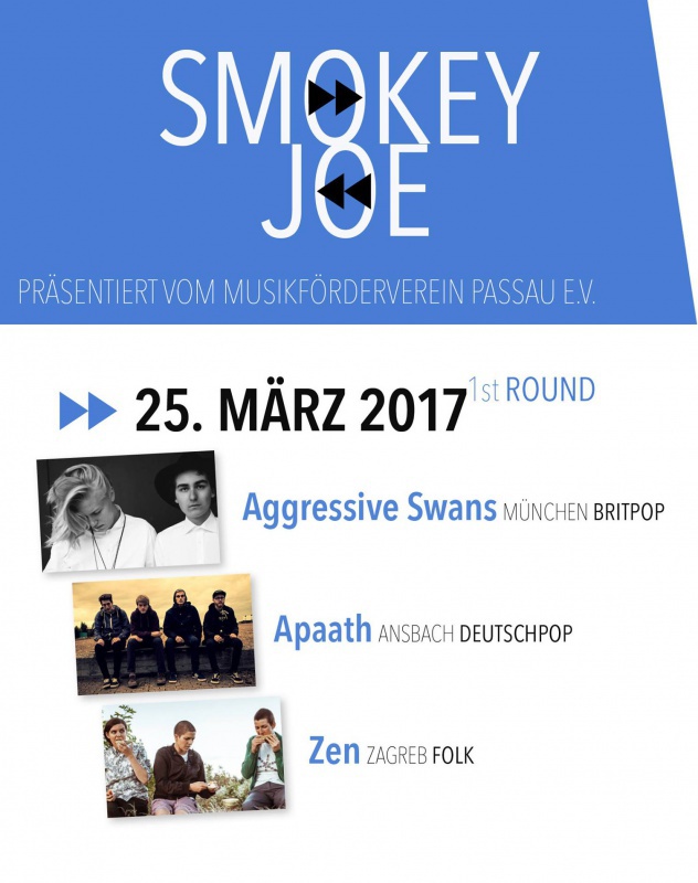 Der Smokey Joe Music Award ist ein Passauer Musikpreis, der vom Musikförderverein Passau e. V. seit 2009 jährlich vergeben wird. Auch dieses Jahr treten wieder 9 handverlesene hochkarätige Bands in der Tabakfabrik Passau auf.