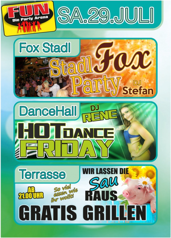 HOT Dance Friday in der Dance Hall und Stadl Fox Party mit DJ Stefan, auf der Terrasse lassen wir die Sau raus - gratis Grillen ab 21.00 Uhr, so viel essen wie ihr wollt!