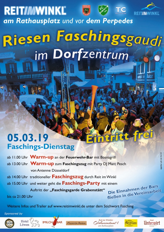 Desweiteren findet auch ein Närrisch, lustiger Faschingszug mit Beteiligung vieler Vereine und Gruppen durch den Ortskern mit mehreren Runden statt. Dieser wird angeführt von der Musikkapelle Reit im Winkl, lustig moderriet vom Rathausbalkon.
