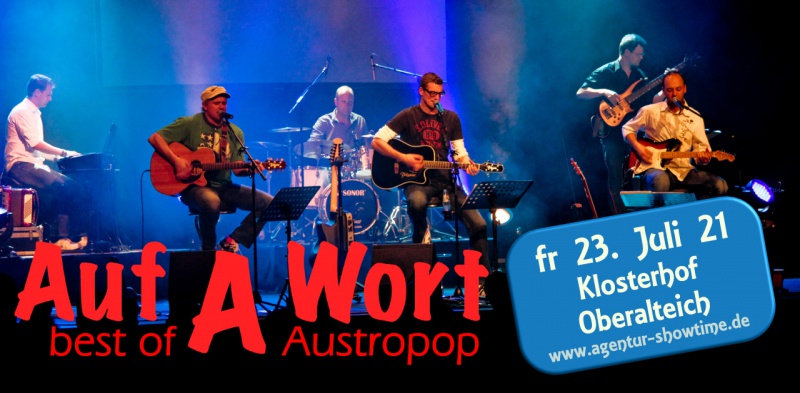 Falco, Wolfgang Ambros, Rainhard Fendrich, EAV, STS, OPUS; die Liste der Pop-Legenden aus der Alpenrepublik scheint unendlich zu sein. Bis heute bringt die dortige Musiklandschaft Hits hervor, die unterschiedlichste Generationen gleichermaßen begeistern und nie in Vergessenheit geraten. Die Band Auf AW Wort ist eine der besten STS Cover Bands, und umrahmt unter anderem die erfolgreiche Live-Musikshow „I am from Austria“. Sie ist so authentisch, wenn es um die größten Hits der österreichischen Musikgeschichte geht, daß sie mittlerweile auch im Ursprungsland zahlreiche Auftritte absolviert und tausende Fans zum Toben bringt. Kaum ein Song, den man nicht kennt oder nicht mitsingen könnte. Deshalb sind die Konzerte von Auf A Wort musikalische Êreignisse zum Erinnern, Feiern und Mitmachen.